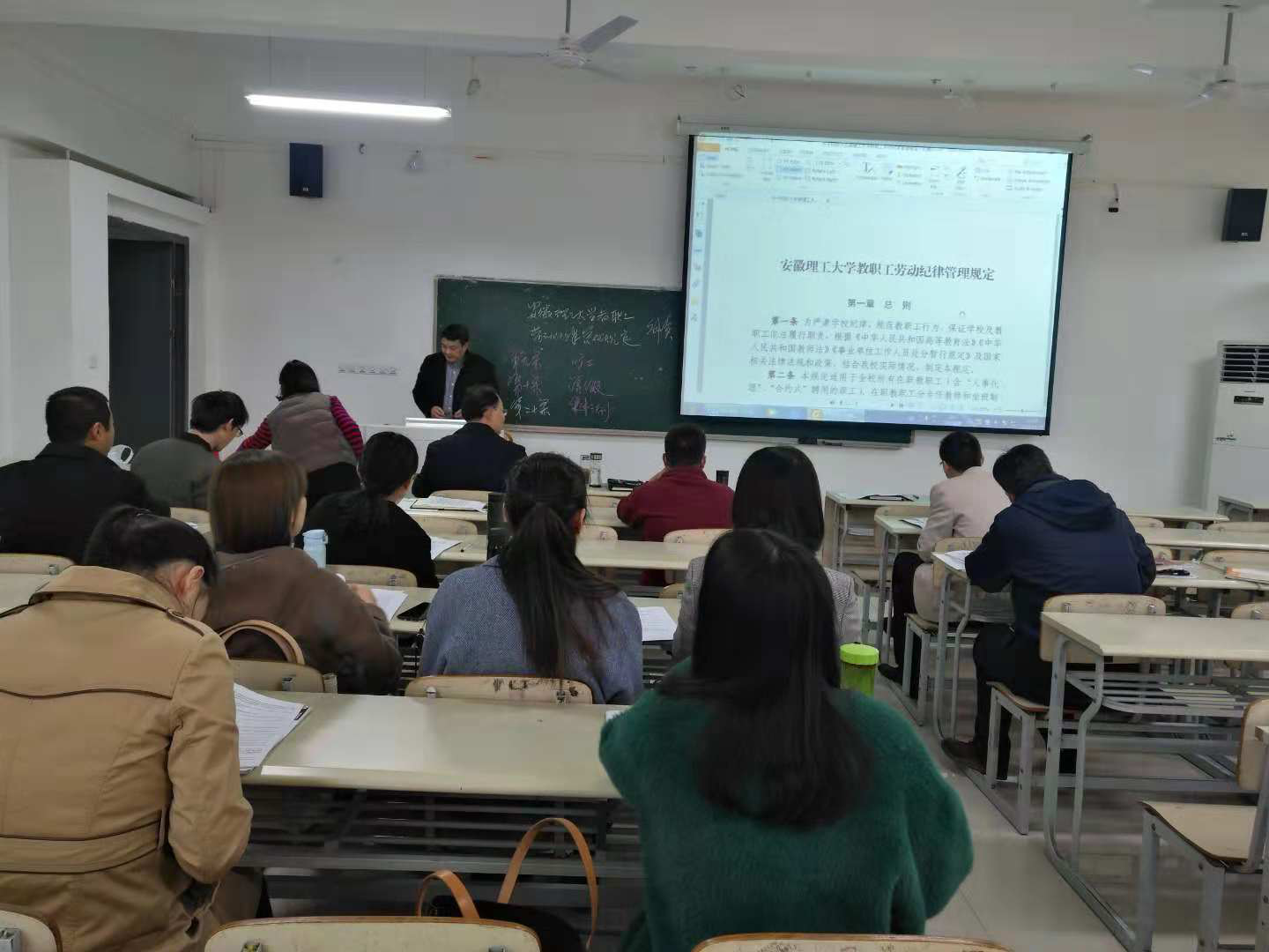此次集体活动中,学院院长谢振安带领全体教职工集体学习了《安徽理工大学教职工劳动纪律管理规定》。谢振安重点阐述了学校制定施行教职工劳动纪律管理规定的意义和作用,又分别从劳动纪律、请假与销假、假期与待遇、考勤与检查、违纪处理等方面进行了详细解读,还结合学院实际情况,指出了学院当前管理上存在的一些 “宽、松、软”现象,希望各位老师认真学习并严格遵守学校文件规定。他表示学院将认真落实集体活动的组织管理、劳动纪律考勤检查等一系列规定。