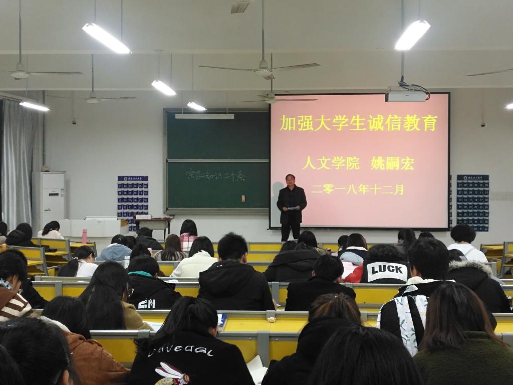 12月3日晚,人文学院在天工南216教室举办《加强大学生诚信教育》专题讲座,由学院党总支副书记、副院长姚嗣宏主讲。