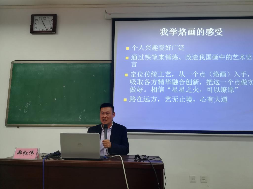 郑红伟首先介绍了安徽工艺画的种类,然后结合自己多年从事烙画创作的经验,讲解了烙画的起源、制作烙画的工具和材料,以及烙画创作的技法与制作过程、装裱等。郑老师详细的讲解和演示引起了师生对烙画的广泛兴趣。