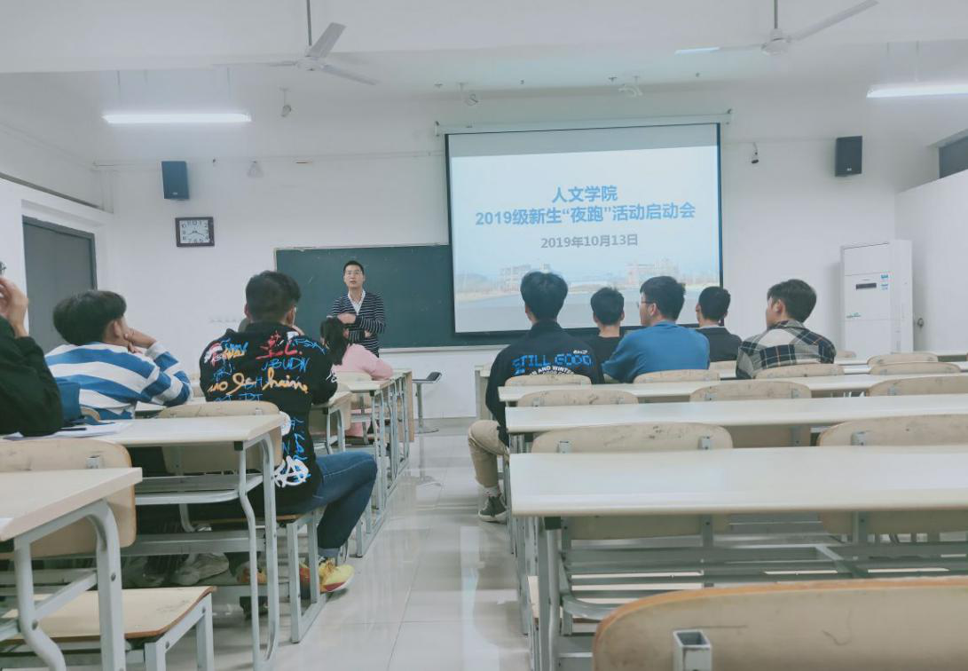 2019年10月13日晚8时20分,人文学院以“青春夜跑,追月逐梦”为主题的夜跑活动启动会在崇智楼A333教室召开,出席启动会的有新生辅导员闪诚章老师以及2019级各班体育委员、纪律委员、组织委员。