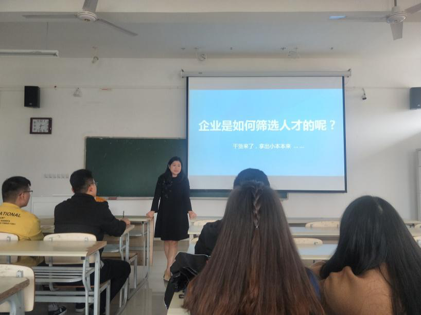 刘莉主要从毕业后方向如何选择?从就业、考研、出国几个方面结合自身经验和实例做了具体的介绍。她分析了大学生求职方向不清晰的现状和原因,对大学生求职简历的撰写、面试技巧等方面做了具体指导,对不同企业的要求要做好不同的面试准备等,都做了详细的说明。讲座中还设计了互动环节。精彩的宣讲在同学们的热烈掌声掌声中圆满结束。