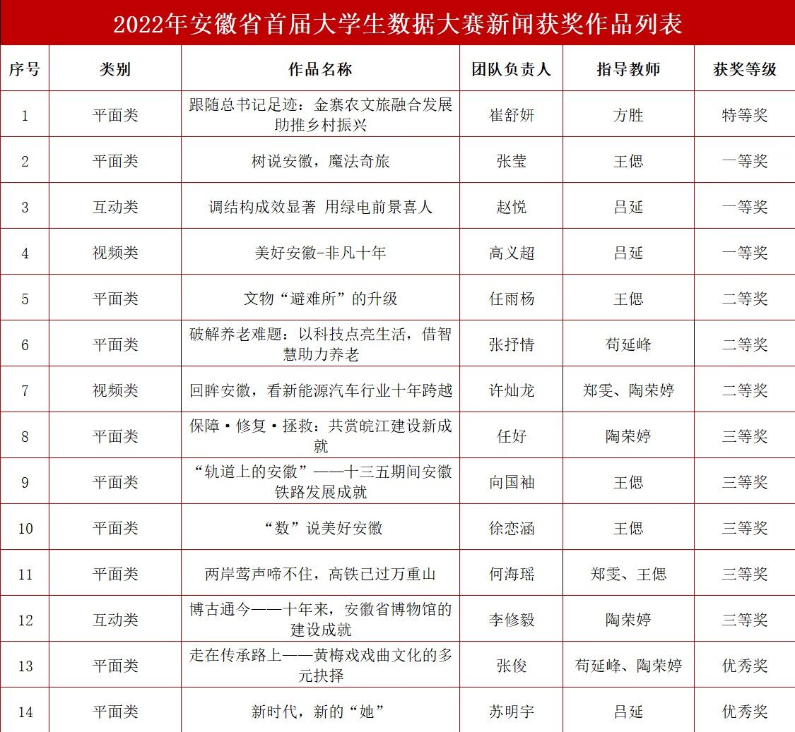 11月19日,安徽省首届大学生数据新闻大赛决赛圆满落幕。我校学子勇创佳绩,荣获特等奖1项、一等奖3项、二等奖3项、三等奖5项、优秀奖2项,学校获得优秀组织奖,5位老师获优秀指导教师荣誉称号。