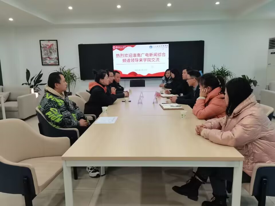 2月27日下午,淮南电视台新闻总监陆璐、主播王亮等一行4人应邀来校洽谈新一轮合作,人文社会科学学院方胜院长和传媒系老师们热情接待了陆璐一行。