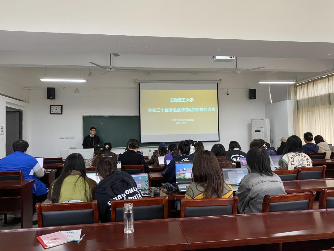 4月24日下午,人文学院联合上海积途信息科技有限公司在崇智楼A333教室开展社会工作全景化虚拟仿真实务技能大赛,大赛由上海积途安徽办事处负责人孙念星主持。