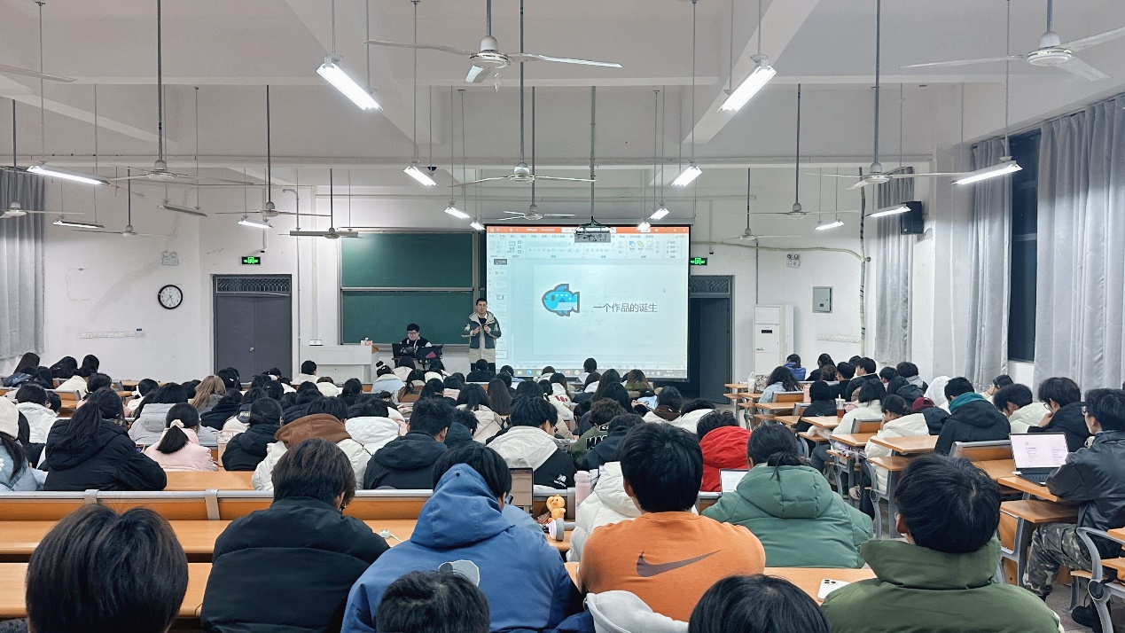 俞志升和周诚两位同学的摄影摄像和导演创作等实践能力都很强,二人连续两届荣获安徽省大学生微电影大赛一等奖。培训内容涵盖剧本创作、摄像参数、电影运镜、拍摄分工等四个主要方面,重点阐述蒙太奇手法,详细解读如何制造两个镜头之间的联系,体现画面衔接的对立统一,“掌握了蒙太奇就等于进入了影视制作范式的核心”。强调实践操作重要性的同时,他二人还耐心细致地回顾了短视频创作的“喜乐汇”,分享了自己参加各类学科竞赛的经验。