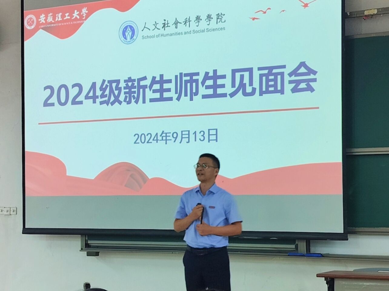 9月13日下午2点30,人文学院在明理106教室举办了盛大的师生见面会。学院党政领导班子、各教研室主任及专兼职辅导员等悉数到场,表达对新生的热烈欢迎。学院党政主要负责人方胜寄语新同学,他从“团结、奋进、博学、奉献”八字校训出发,表达学院对新生的期待,同时要求同学们弘扬“志存高远、追求卓越、求真务实”的校园文化精神,增强对学校、学院的自豪感和归属感。