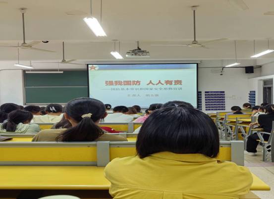 9月29日下午,人文学院邀请淮南市大通区委常委、武装部政委胡玉强大校为全体新生开展国防教育。他简要介绍了当前世界面临的形势,在新时代大学生必须要有所为、有所不为,详细讲解了大学生征兵入伍政策、优抚待遇,鼓励在校大学生勇敢携笔从戎,保家卫国,把小我融入大我,展现新时代大学生的担当与作为。