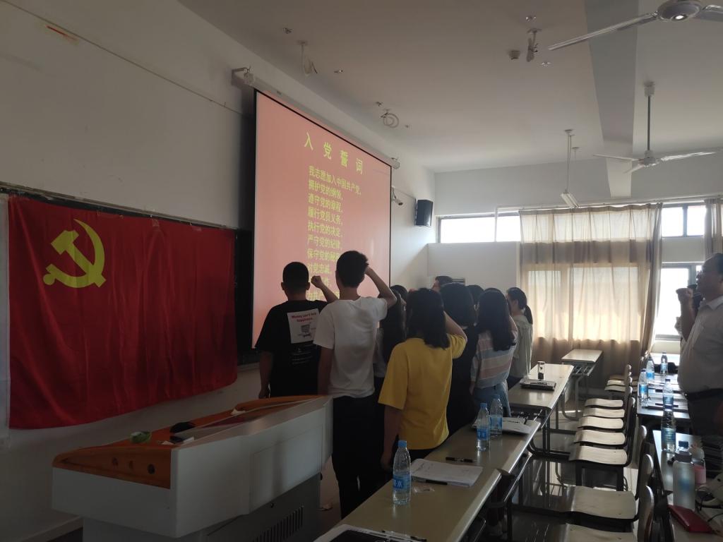 全体新老党员面向鲜艳的党旗宣誓,宣誓声音整齐、洪亮而坚定。宣誓后,吴云平作了讲话。他强调:作为学生党员,我们从年轻的时候就立志追随党,跟党走,这是正确的选择,也无比荣耀。毕业后无论是就业、还是继续攻读研究生,一定要牢记自己是一名共产党员,不忘初心和使命,既仰望天空,又脚踏实地,发挥先锋模范作用,时刻向党看齐,讲学习,讲政治,讲奉献,在各行各业做出好成绩,为母校争光彩。