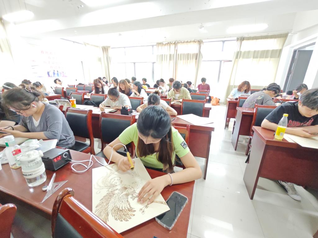 学生烙制实践教学环节中,郑红伟亲自为每一位辅导,从起稿到操作烙铁,并为同学们解答疑问。让同学位多练习使用烙铁,把握好温度、力度和速度,时刻掌控好火候,在郑红伟的指导下,同学们热情很高,感觉烙铁真的很神奇,能制作出不一样的美术作品。从生涩的用笔到最后能画出流畅的线条,同学们最后都逐渐熟练了烙铁工具,并烫出了一幅幅满意的烙画。活动进行了四个小时,同学位仍意犹未尽,深深地被传统工艺非遗烙画的魅力所感染,更增加对中国的传统民间艺术文化的热爱之情。