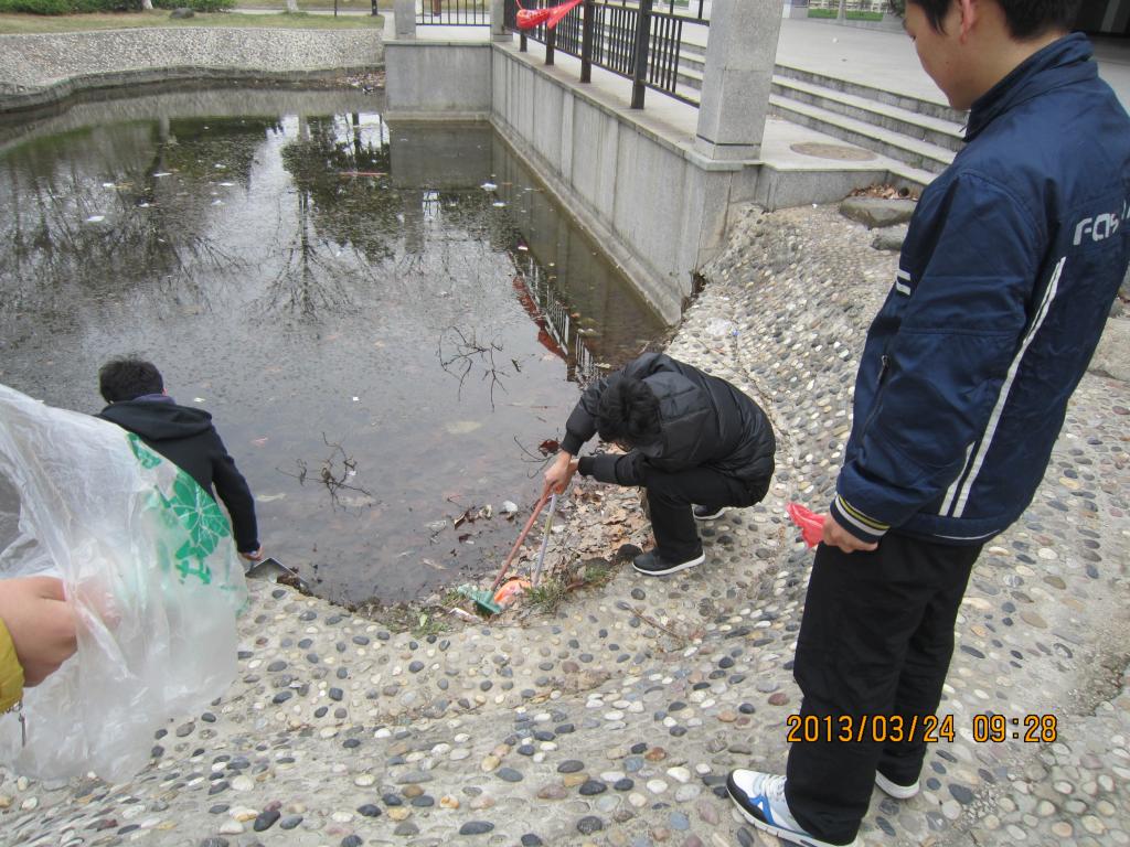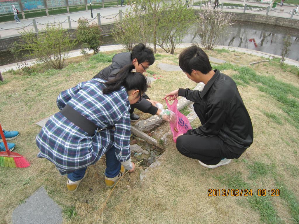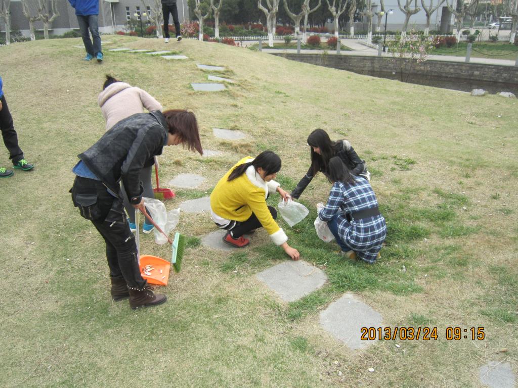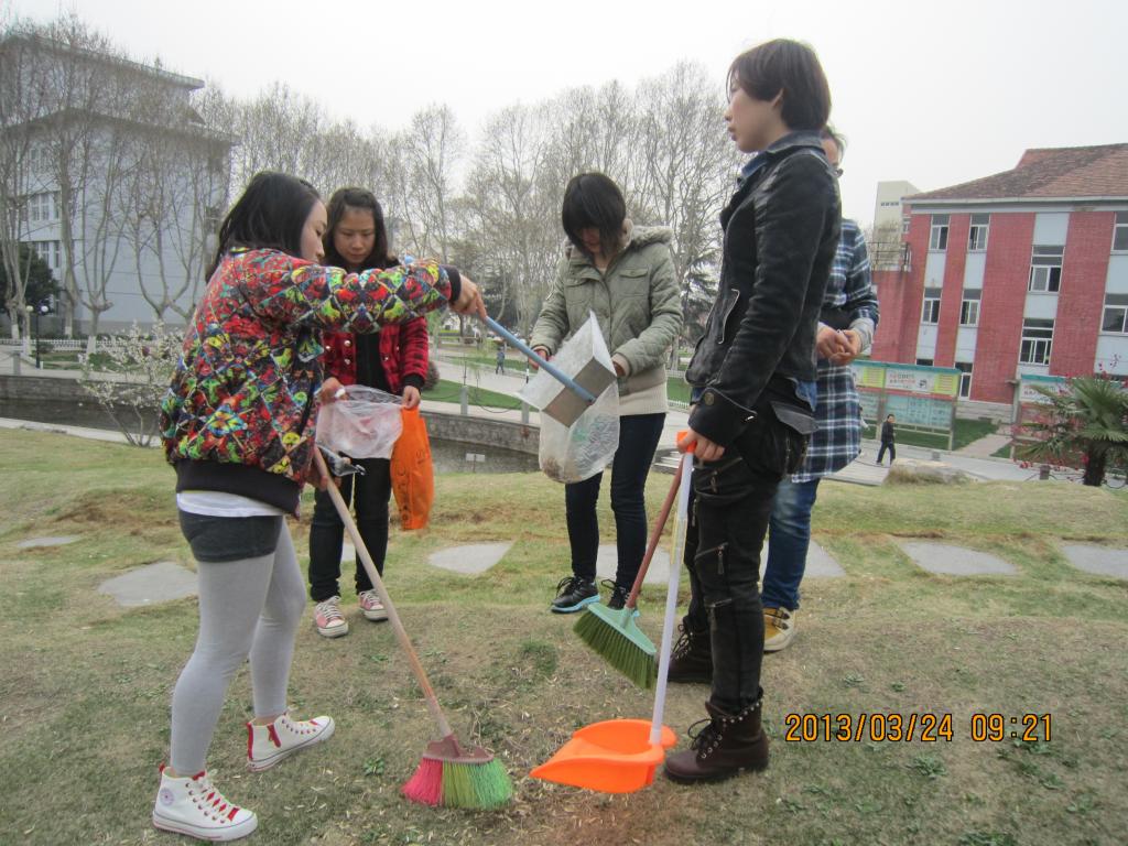 2013年3月24日,政治学与行政学2011级1班的青年志愿者在校园内开展环境卫生整治工作。