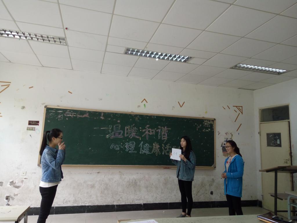 学院女生部和体育部于红楼106教室举办大学生心理健康节活动。活动第一项是“你猜我说”,一位同学在黑板上随意写出一个词语或句子,正对黑板的同学用动作和语言进行解释,背对黑板的同学要正确猜出该词语。第二项是双人背夹球,多组同学齐心协力、共同协作完成了该项游戏。这一系列的小游戏不仅有效提高我们的心理素质,更增强了同学之间的凝聚力。