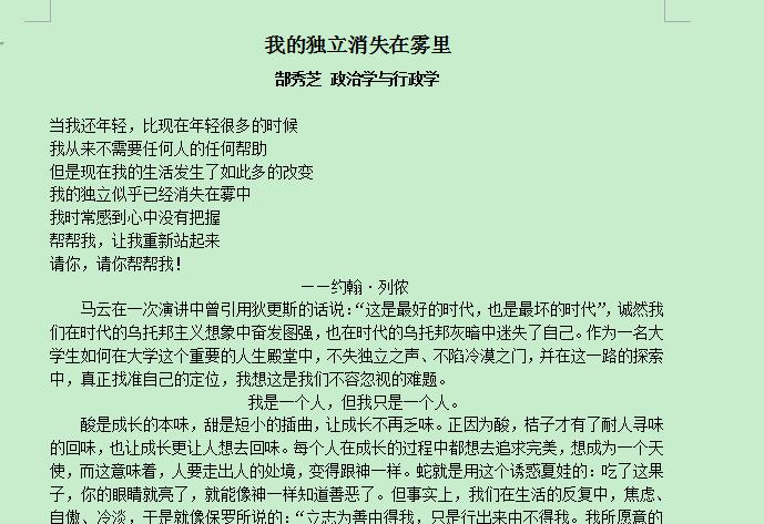 在本次征文比赛中,政治学与行政学15-1班的郜秀芝同学的作品《我的独立消失在雾里》尤为出彩,深刻表现出了当代大学生典型的社会化过程中的心路历程,荣获比赛一等奖;政治学与行政学14-1班的孟驰同学的现代诗作品《爷爷》文采斐然,情感真挚,荣获二等奖;周洁、郝端苗等七位同学荣获三等奖。