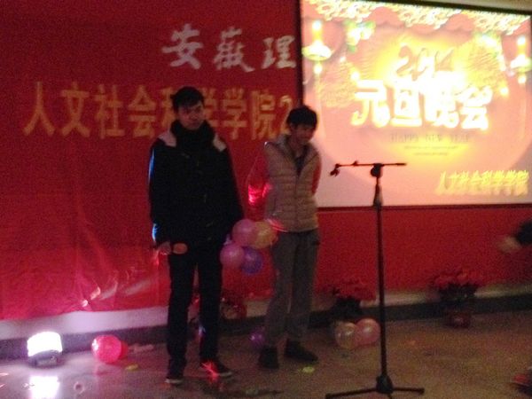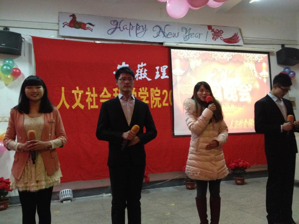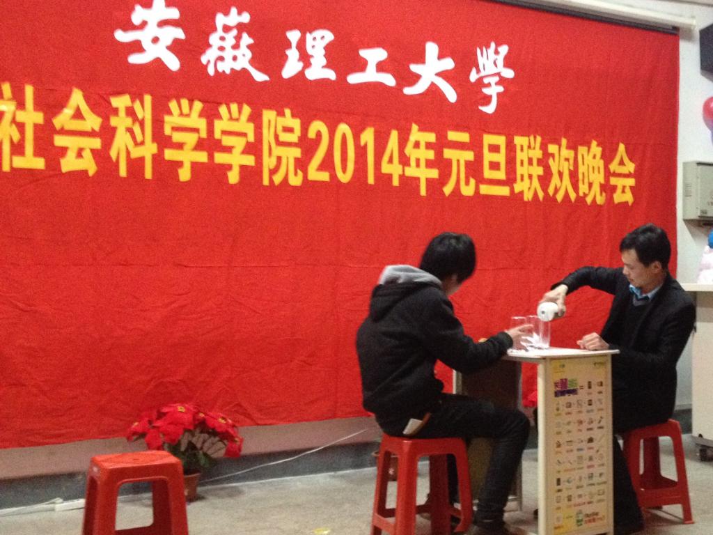 12月26日晚7点,我院在401教室举办了2014年元旦联欢晚会,学院党委副书记吴云平、辅导员张娜、团委书记陈会、朱俊奇老师、陈旭老师学生会成员以及大一全体参加了此次晚会。