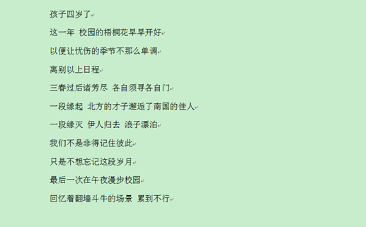 为表达对大学生活的眷恋,抒发对毕业学子的不舍,人文学院于5月15日——6月4日开展“毕业生诗歌征集活动”。毕业生们即将离开生活四年的母校,纷纷投稿表达自己对学校的不舍,对老师的感谢以及对学弟学妹们的殷切期望,学弟学妹们也将自己对毕业生们的情感酝酿在心间,书写在纸上。此次活动为人文学子提供了“情有千万种,待与他人说”的平台,同时也显示了人文师生“一家亲”的深厚情感。