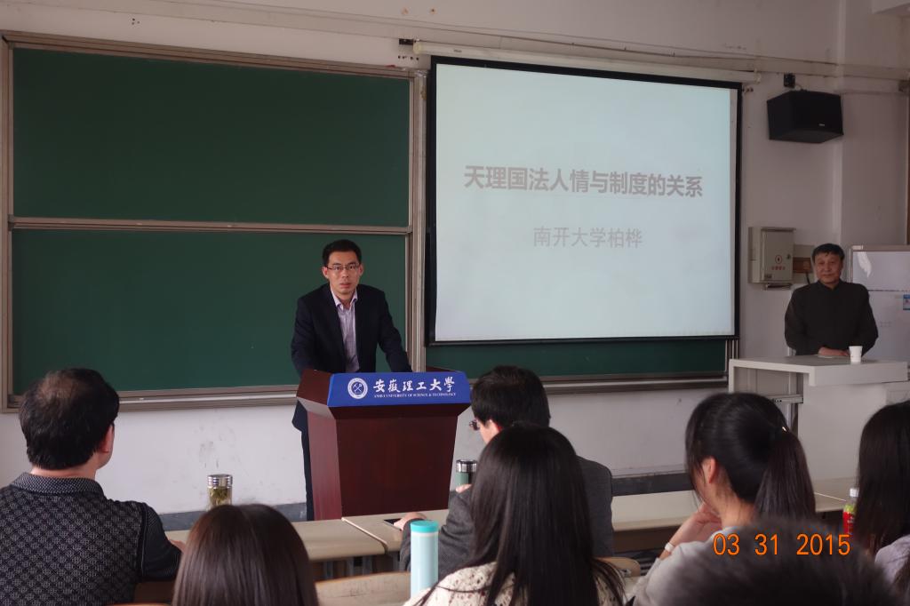 3月31日下午,南开大学法学院教授、博士生导师柏桦应邀来到人文社会科学学院,作题为《天理国法人情与制度的关系》的学术报告。作为迎接“校庆70周年学术讲坛”系列学术报告之一,本次学术报告会由人文社会科学学院、思想政治理论课教学部和科技产业处主办。人文社会科学学院院长杨力教授主持报告会。