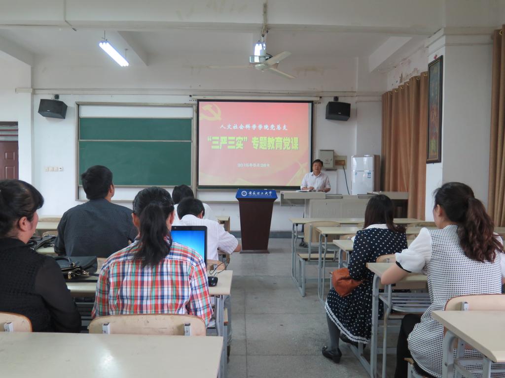 5月28日上午,人文学院“三严三实”专题教育党课在学院楼401教室开讲,学院党总支书记秦朗为教职工党员授课,学院领导杨力、吴云平共同聆听了党课。