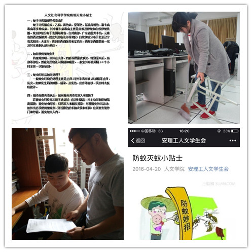 学院积极组织设计爱国卫生宣传单,用图文并茂的方式展示了灭蚊防蚊知识,并组织同学在学生宿舍分发、宣传,同时利用微博、微信等新媒体积极做好宣传工作。
