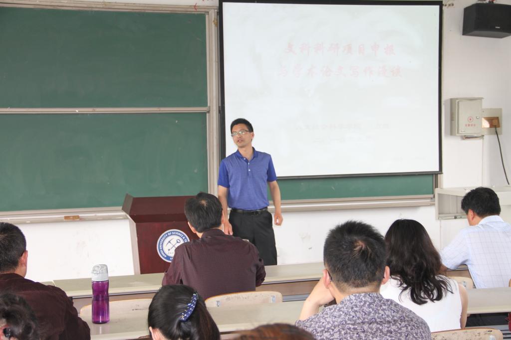为调动青年教师申报科研项目的积极性,提升青年教师的科研能力,5月6日上午,人文学院和马克思主义学院在学院楼401教室联合举办了一场科研项目申报专题讲座。讲座由人文学院人文素质发展中心副教授、中国传统文化研究所所长方胜主讲。两个学院近40名青年教师聆听了讲座。