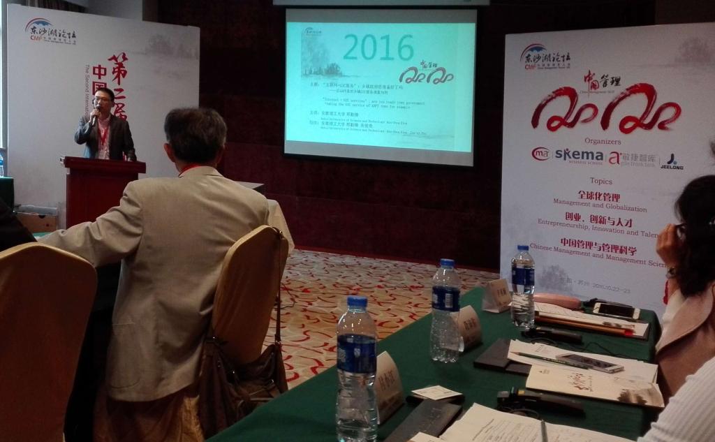 10月22至23日,由中国管理科学学会主办的主题为“中国管理2020”的第四届“中国管理百人会”暨第二届中国管理国际学术会议在苏州召开,我校人文社会科学学院政治学与行政学系、社会工作系主任朱俊奇、政治学系教师邢勤峰应邀参加会议。会上,中外学者进行了激烈的学术争鸣,与会专家从140多篇高水平学术论文中遴选15篇优秀论文并现场颁奖,由朱俊奇和邢勤峰合作共同完成的论文《“互联网+”背景下:G2C服务治理研究——以AHFY县乡镇政府G2C服务为例》最终获评第二届中国管理国际学术会议“优秀论文奖”,并就论文主题同与会中外学者做现场交流。通过交流,增长了见识,扩大了学院的影响力,提高了学校的知名度。