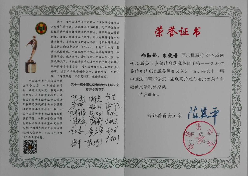 近日,人文学院教师邢勤锋、朱俊奇提交的论文《“互联网+G2C服务”:乡镇政府您准备好了吗——以AHFY县的乡镇G2C服务调查为例》从全国3042篇论文中脱颖而出,在以“互联网治理与法治发展”为主题的第十一届中国法学青年论坛上获主题征文优秀奖。此次论文评定全部由最高人民法院、最高人民检察院、中国社会科学院、北京大学、清华大学、人民大学、阿里巴巴集团等政界、学界、商界知名专家匿名评审、遴选确认。
