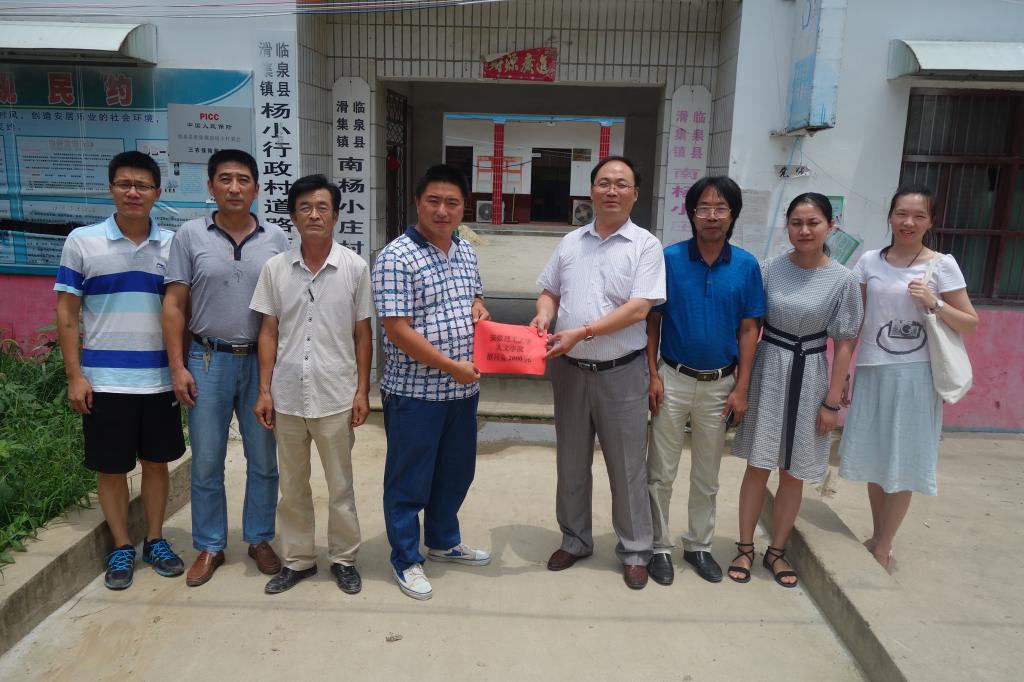 在村部,吴云平代表人文学院将2000元扶贫慰问金作为贫困村党组织建设经费转交给南杨小庄村党支部书记。