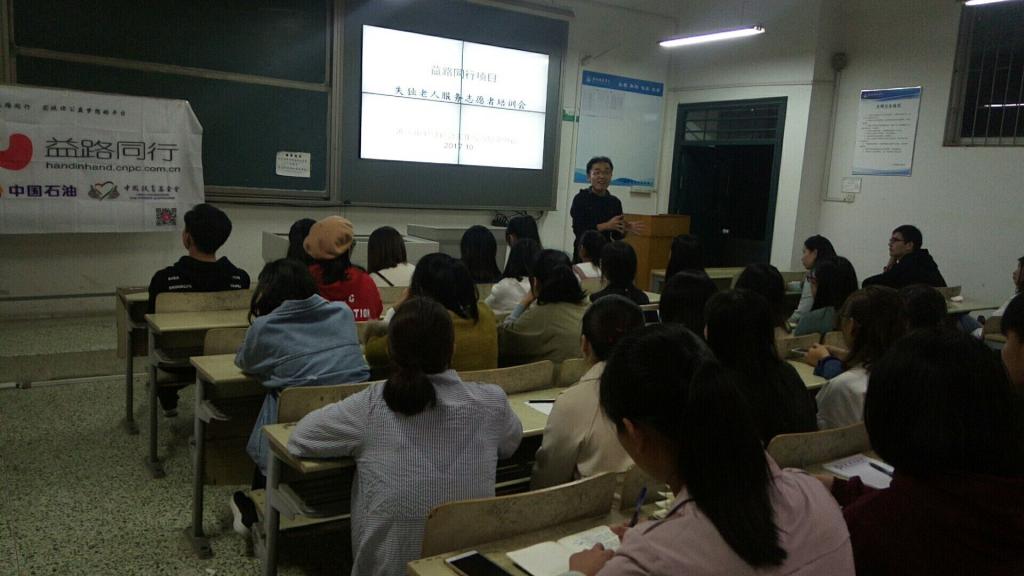本学期,人文学院社会工作专业首次与兄弟院校淮南师范学院社会工作专业进行专业实践合作,共同开展失独老人志愿服务项目。10月20日,学院社会工作2016级同学参加了淮南师范学院姚政宏老师关于“失独老人志愿服务项目”志愿者培训的讲座,为后期即将开展的失独老人志愿服务工作做准备。讲座上,姚老师系统讲述了项目的发展历程以及志愿者在社工服务实践中的服务技巧与注意事项。学院同学认真聆听了讲座并作了详细记录,积极认真的优秀表现受到项目培训老师和其他志愿者的一致好评。