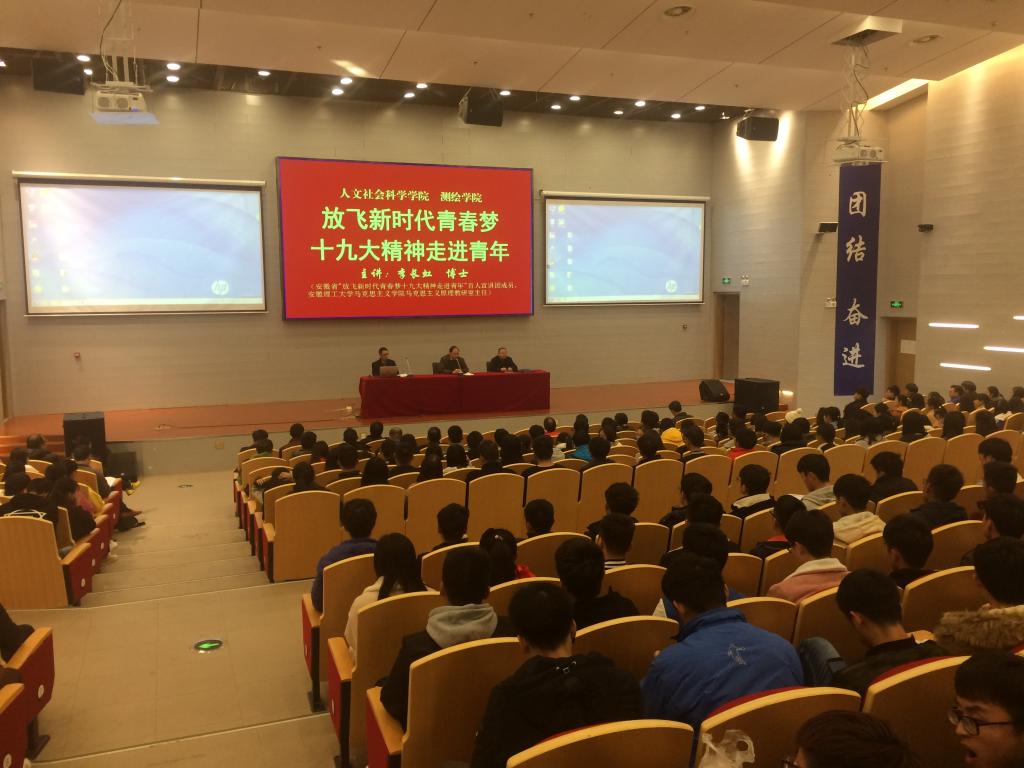 12月1日下午,人文学院、测绘学院在舜耕会堂联合举办学习贯彻党的十九大精神专题报告会,邀请安徽省“放飞新时代青春梦 十九大精神走进青年”百人宣讲团成员、马克思主义学院马克思主义原理教研室主任李长虹博士作宣讲报告。报告会由人文学院党总支书记吴云平主持。人文学院、测绘学院党员及低年级入党积极分子参加了报告会。