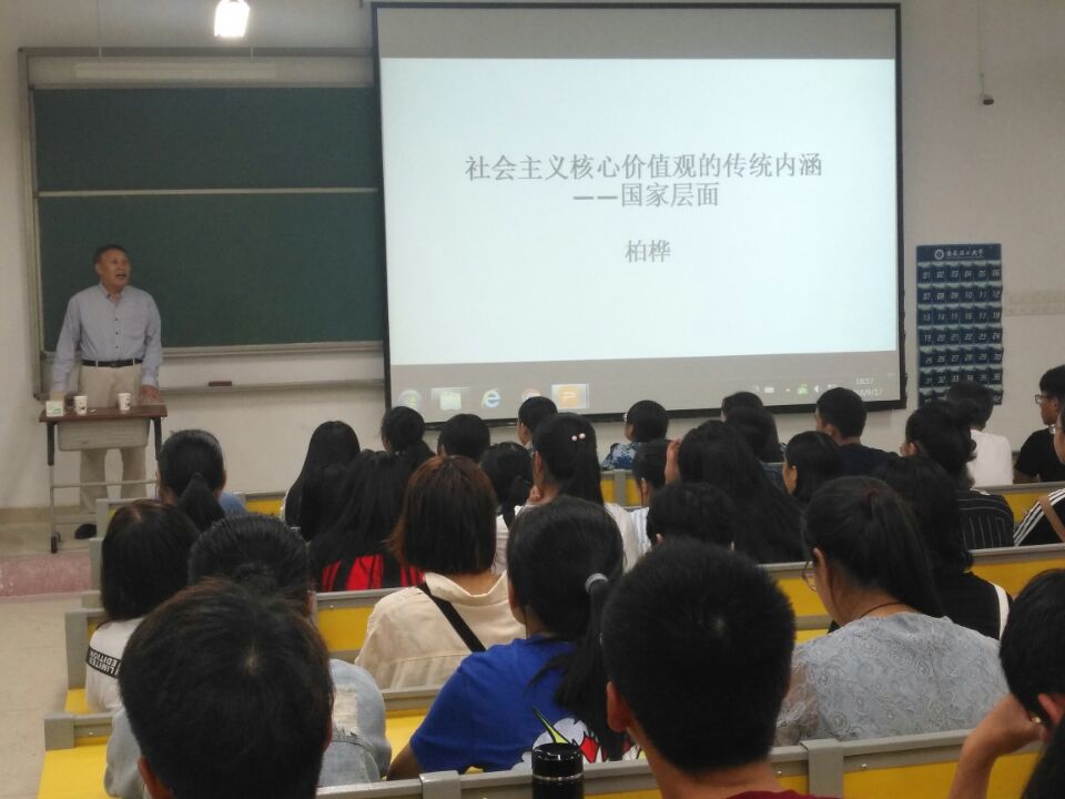 9月17日晚上7点,我院著名教授、博士生导师柏桦在学校天工南216教室作了一场《社会主义核心价值观的传统内涵——国家层面》的专题报告,学院2018级全体新生聆听了报告,学院党总支副书记主持报告会。