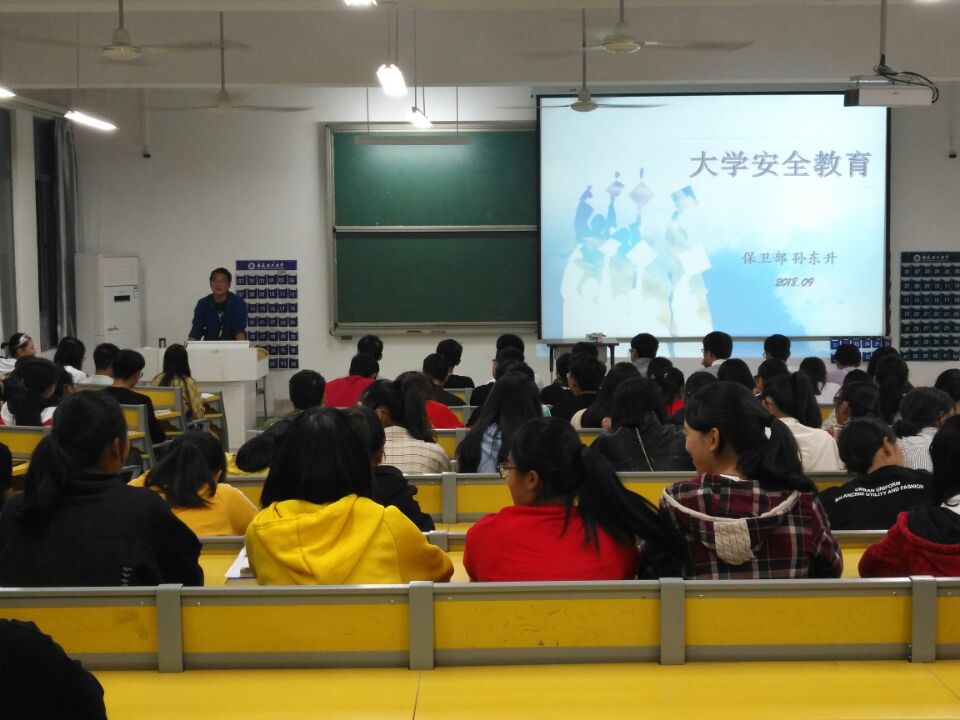 2018年9月26日晚上7点,人文学院在天工南楼216教室举办安全教育知识讲座,全体大一新生聆听了讲座,保卫部孙东升副部长主讲,学院党总支副书记主持。