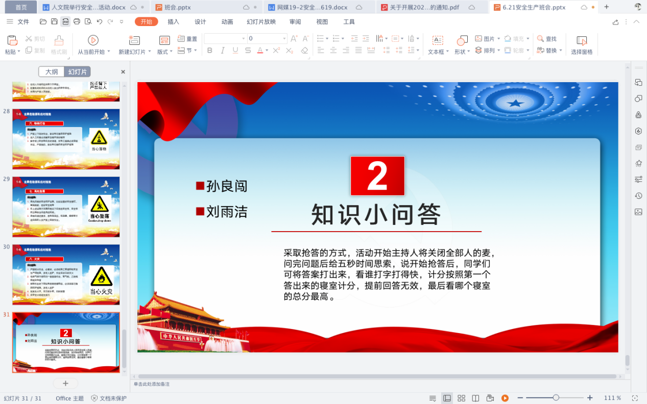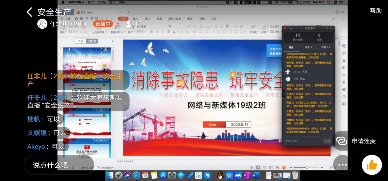 召开线上主题班会。6月17日至21日,学院各个班级在班内召开“安全生产月”线上班会活动,介绍了安全生产月的意义及基本安全知识以。其中网媒19-2班通过班委演讲的方式,把日常生活中常出现的安全隐患进行了介绍并提醒班级同学采取相关措施提防,并点出安全隐患常发生的地点和方式;政行19-2班则以“知识小问答”的方式帮助同学们更好的记忆和理解与安全生产相关的知识。