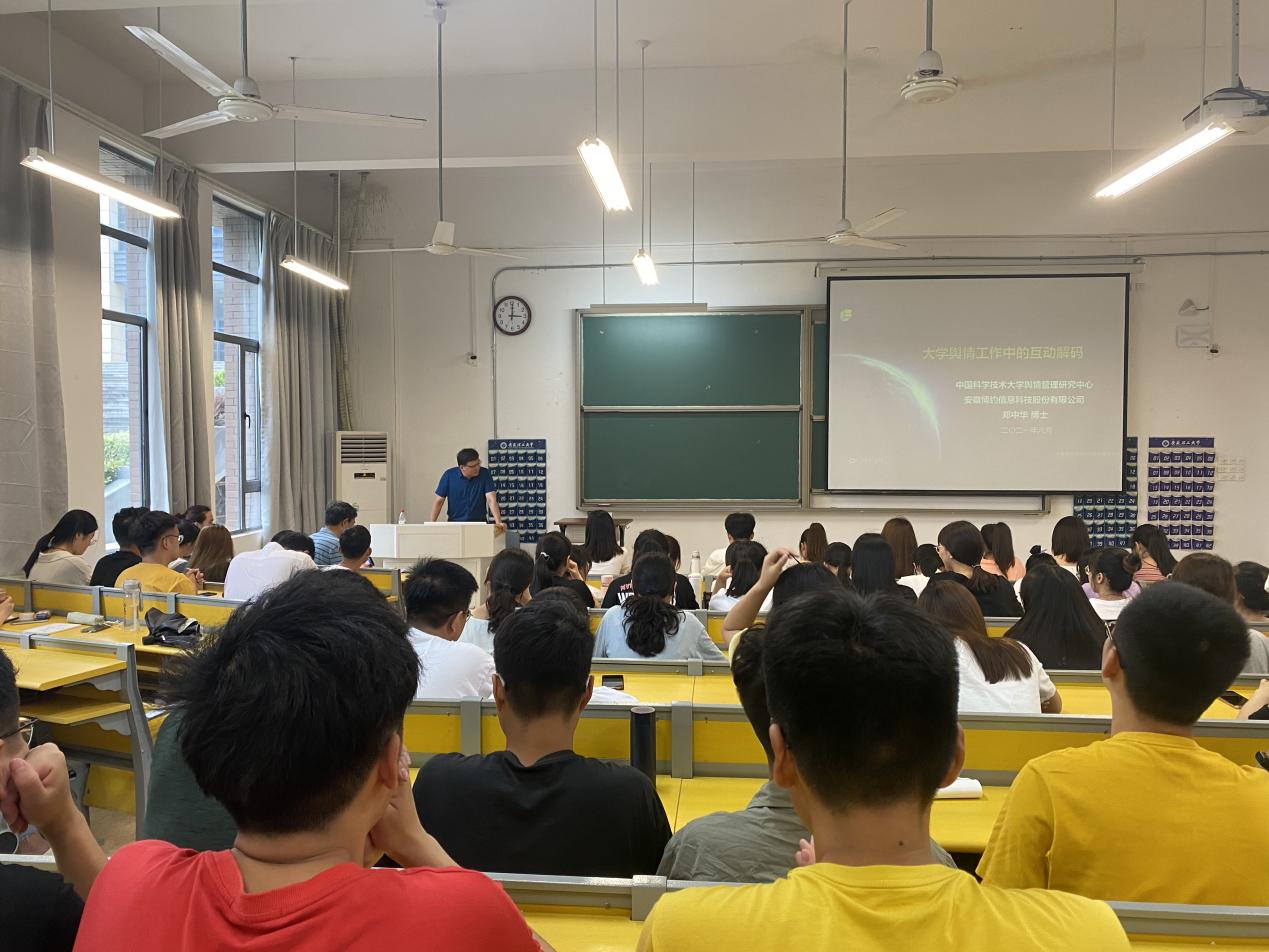 会场上,学院院长谢振安介绍了安徽博约信息科技股份有限公司的基本情况,作为国内“舆情大数据第一股”的上市公司,该企业处于国内行业领先水平。企业创始人郑中华博士以“大学舆情工作中的互动解码”为题做了宣讲,企业人事主管陈荷花就企业文化、工作性质、规章制度、薪资待遇、员工培养模式及晋升通道进行了讲解,并结合自己与内部员工的工作经历分享了工作经验与就业心得,与同学们进行了积极互动。