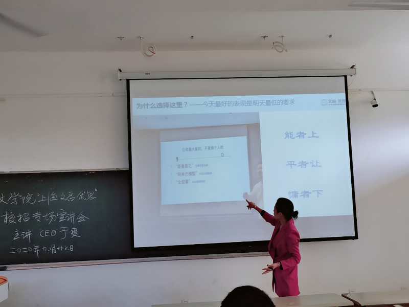 9月27日下午,人文学院在崇智楼333举行专场招聘会,邀请文启优思90后CEO于爽为四个专业进行招聘会宣讲。2017级四个专业部分学生、毕业班辅导员参加了宣讲会。