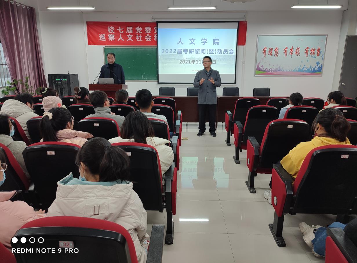 为坚定学院2022届学子考研必胜的信心和勇气,提升应试备考的技巧,11月30日下午,人文学院在崇智楼A329报告厅举办了“漫漫考研路,浓浓关怀情”2022届考研学生慰问活动。学院党委书记王大贤、院长方胜、党委副书记姚嗣宏、带班辅导员以及70余位考研代表参加了活动。