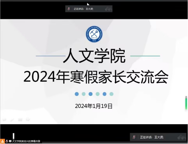 1月19日晚,学院通过腾讯会议平台召开线上家长交流会,会议由周雪晴主持,学院领导班子成员、全体辅导员以及300余位学生家长参加了会议。在会议上,学院院长方胜首先从学科建设、人才培养、师资力量、学科竞赛等方面向家长们详细地介绍了学校、学院一年来取得的重要成绩,并强调继续坚持以生为本,聚焦学生需求,用心做好学生管理服务工作,为学生成长成才创造良好条件。学院党委书记王大贤对参会的家长致以诚挚的欢迎,强调了此次线上家长交流会的重要意义,引导家长多关注孩子在校表现,鼓励孩子多读书,养成良好的学习和生活习惯。最后,在交流互动环节中,家长们踊跃发言,就学业规划、就业考研、大学生应征入伍等方面提出了问题,学院老师进行了细致的答疑解惑。