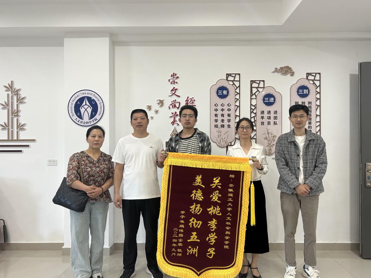 9月23日,社会工作21-1班学生家长崔先生携全家满怀感恩之情来到学校,将一面绣有“关爱桃李学子,美德扬彻五洲”的锦旗赠送给学院,向学院的爱心帮扶之举表示诚挚感谢。