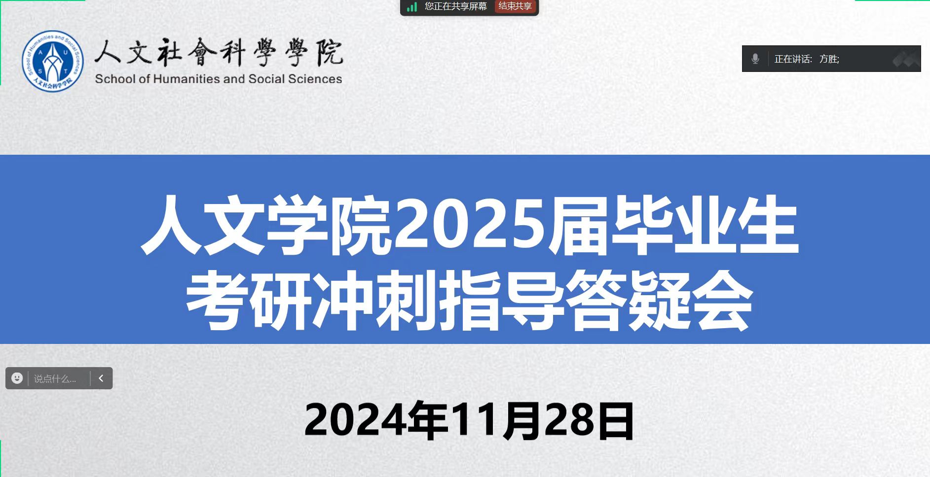 正值考研冲刺之际,为进一步提振学生考研信心、缓解心理压力,全面提高复习质量,11月28日,人文学院通过腾讯会议召开2025届毕业生考研冲刺指导答疑会。学院领导班子成员、专业系主任老师、辅导员以及考研学生参加会议。会议由周雪晴主持。