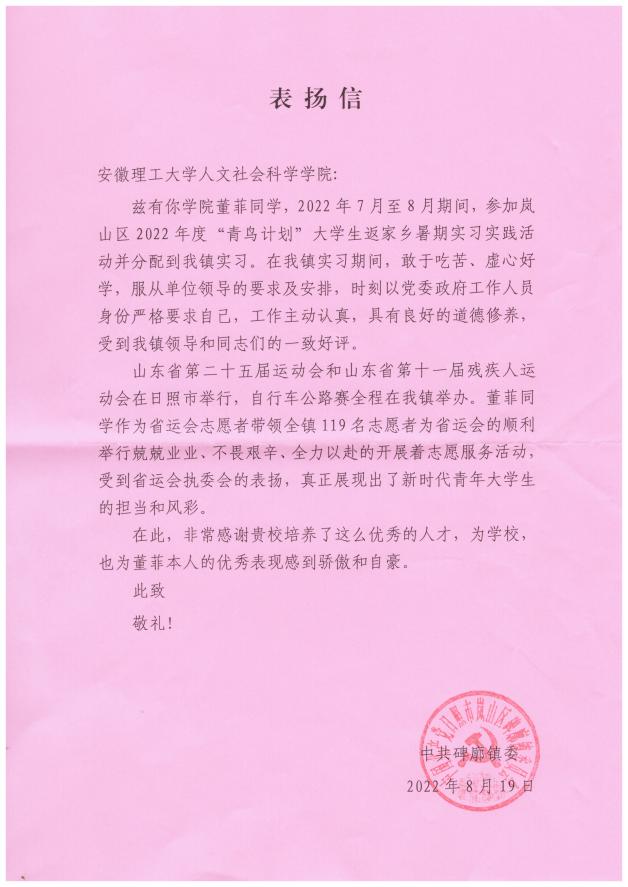 表扬信中提到以董菲同学为代表的志愿者们在省运会期间的优异表现,展现了新时代青年大学生的担当和风采。在信的最后,碑廓镇委也向安徽理工大学表达了由衷的感谢。